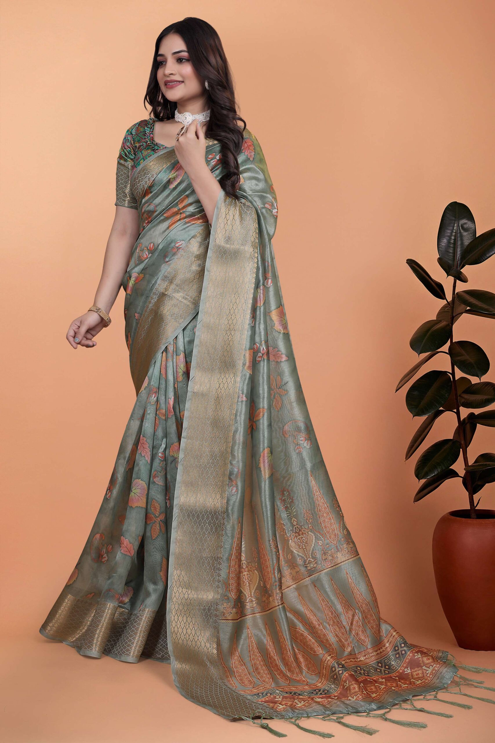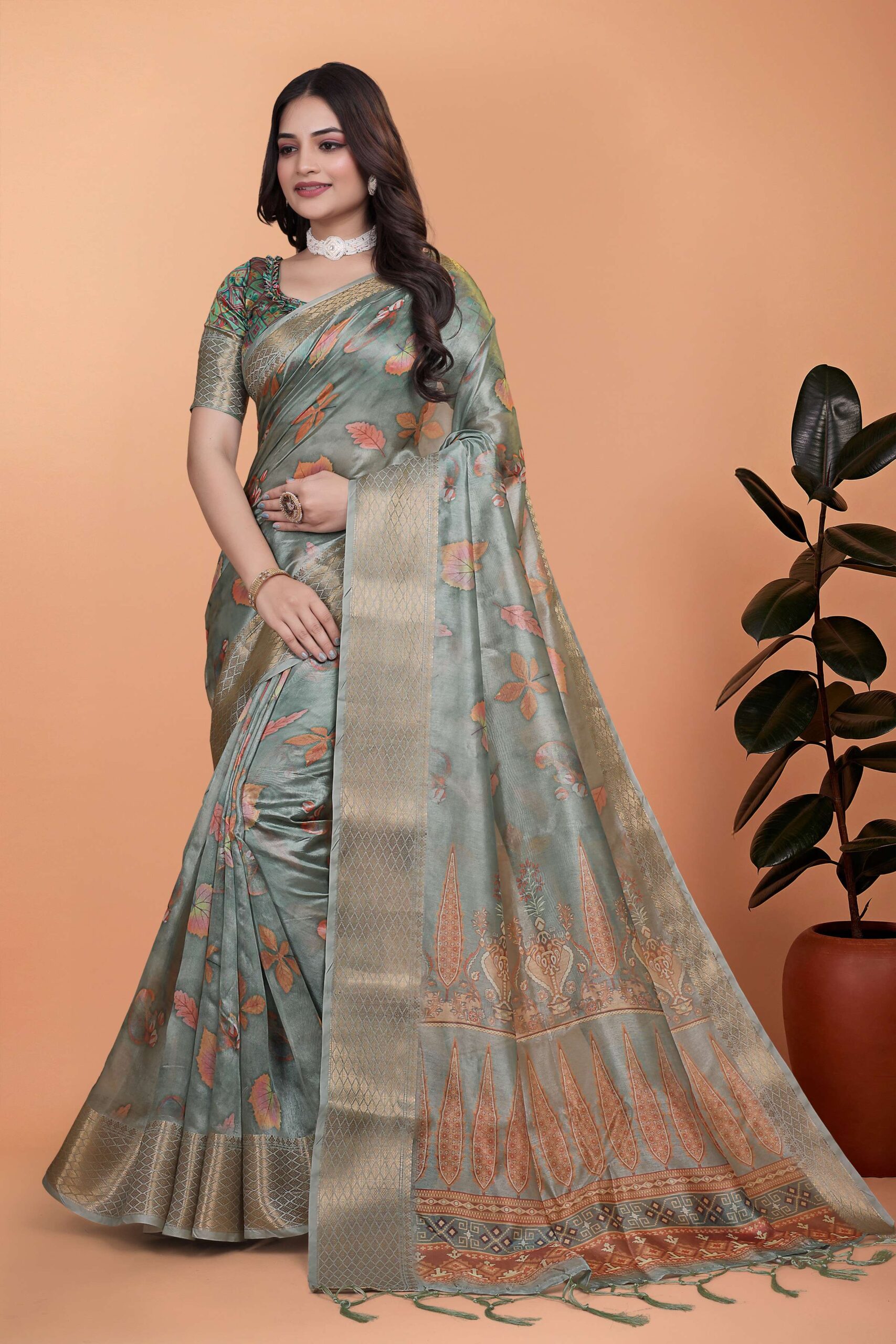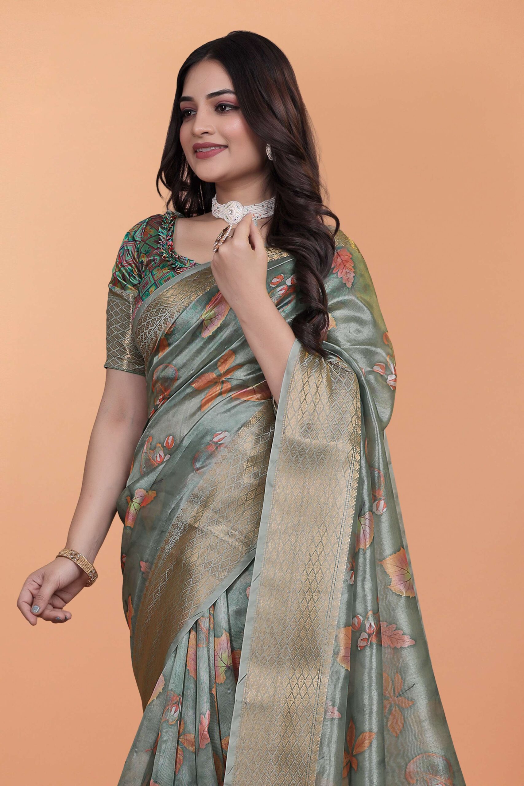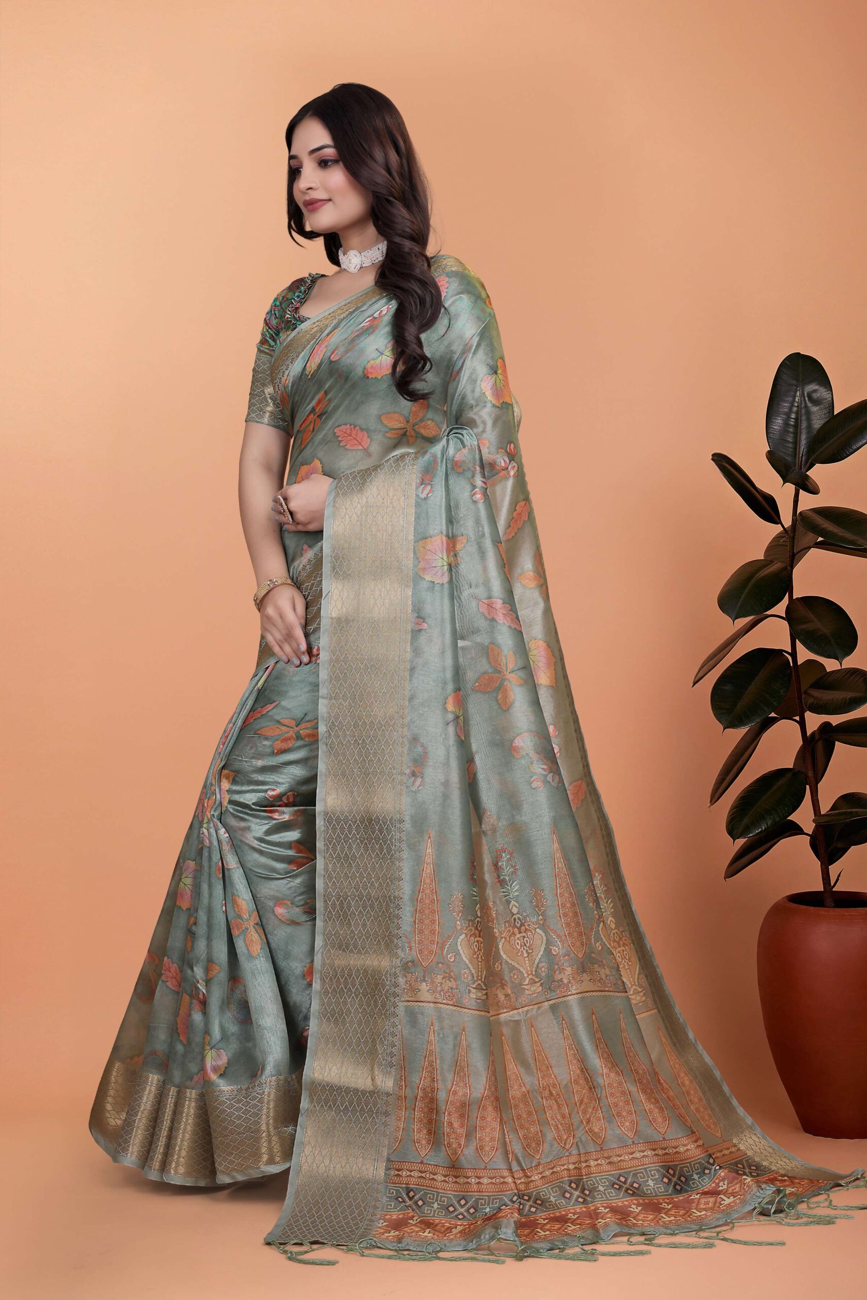 Grace your wardrobe with this refined sage green soft silk saree, adorned with delicate floral prints in soft hues of peach, pink, and rust. The saree showcases a golden woven zari border, exuding timeless charm and richness.